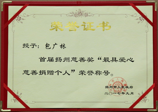 晚會(huì)上頒發(fā)了首屆揚(yáng)州慈善獎(jiǎng);,設(shè)有最具愛心慈善捐贈(zèng)組織獎(jiǎng)、最具感召力慈善工作者獎(jiǎng)、最具愛心慈善捐贈(zèng)個(gè)人獎(jiǎng)、最具愛心慈善行為楷模獎(jiǎng)、最具影響力慈善項(xiàng)目獎(jiǎng),對(duì)那些為公益慈善事業(yè)作出突出貢獻(xiàn)和影響的個(gè)人、組織和項(xiàng)目予以表彰。江蘇新能源置業(yè)集團(tuán)有限公司董事長包廣林榮獲最具愛心慈善捐贈(zèng)個(gè)人獎(jiǎng)。