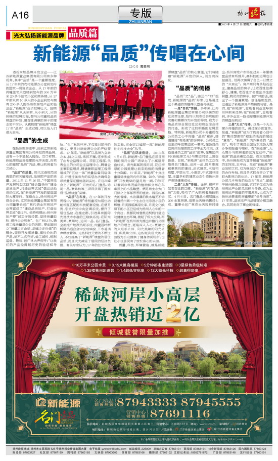 三是大眾;傳播。這是一個(gè)大眾媒介傳播的時(shí)代,通過媒介的宣傳、報(bào)道,新能源;成為了購房者心目中的集體想像物;和生動(dòng)活潑的居住意象;。新能源;內(nèi)外兼修的品質(zhì);,吸引了來自全國及本地各大媒介爭相報(bào)道與喝彩。在新能源;、大眾媒介與購房者的三方互動(dòng)中,新能源;的品質(zhì)更加凸顯。在本地媒體中,揚(yáng)州晚報(bào)成為宣傳報(bào)道新能源;的主陣地、主平臺。早在新能源;事業(yè)發(fā)軔之初,雙方就創(chuàng)辦了綿延至今的合作專版,而且多次聯(lián)合舉辦了有較大影響力的論壇。17年來,新能源公司幾乎所有的動(dòng)態(tài)與亮點(diǎn);,都載于揚(yáng)州晚報(bào)之版面,它們不僅成為揚(yáng)州房地產(chǎn)業(yè)的風(fēng)向標(biāo)與傳奇,成為本報(bào)房地產(chǎn)報(bào)道的不竭源泉,也成為了揚(yáng)州消費(fèi)者購房重要的參考消息;。17年來,品質(zhì)地產(chǎn)與品牌媒介相互融合,共同走向了事業(yè)的輝煌。