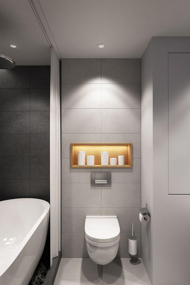 注重實(shí)用性的話可以選擇在馬桶后方的墻面開挖一個壁龕,既不會額外占據(jù)空間,也能伸手就夠到物品,輕松解決了卷紙用光的尷尬。